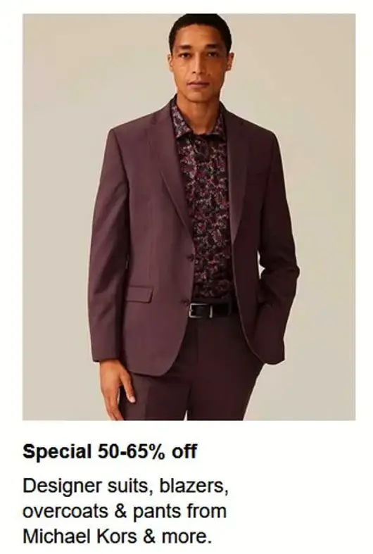 Hurry! Shop in store and get 50-65% off designer suits, blazers, overcoats, & pants from Michael Kors and more.