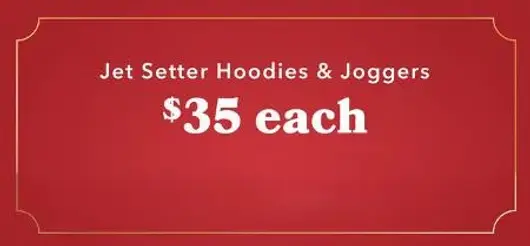 Get it now! Shop in store and get Jet Setter hoodies & joggers for $35 each.