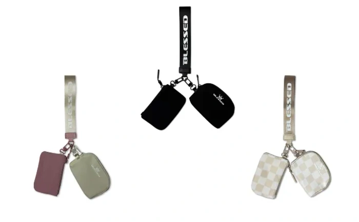 Our Blessed logo wrist strap features two mini bags one for your coins and lipgloss and one for your cards and $. They are available in 5 colors and at $19.95 the perfect gift under $20.